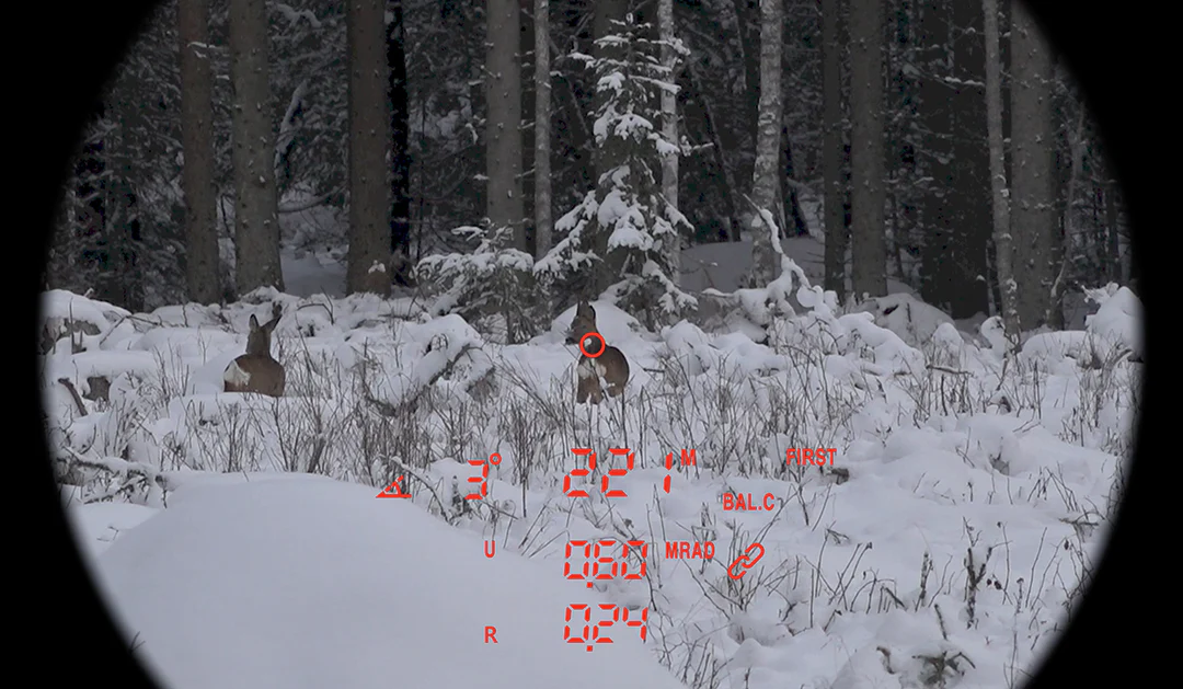 - BAL.C (Ballistik Kalkylator): Direkt måldistans visas, men dessutom visas även data för höjd och vindstyrka.